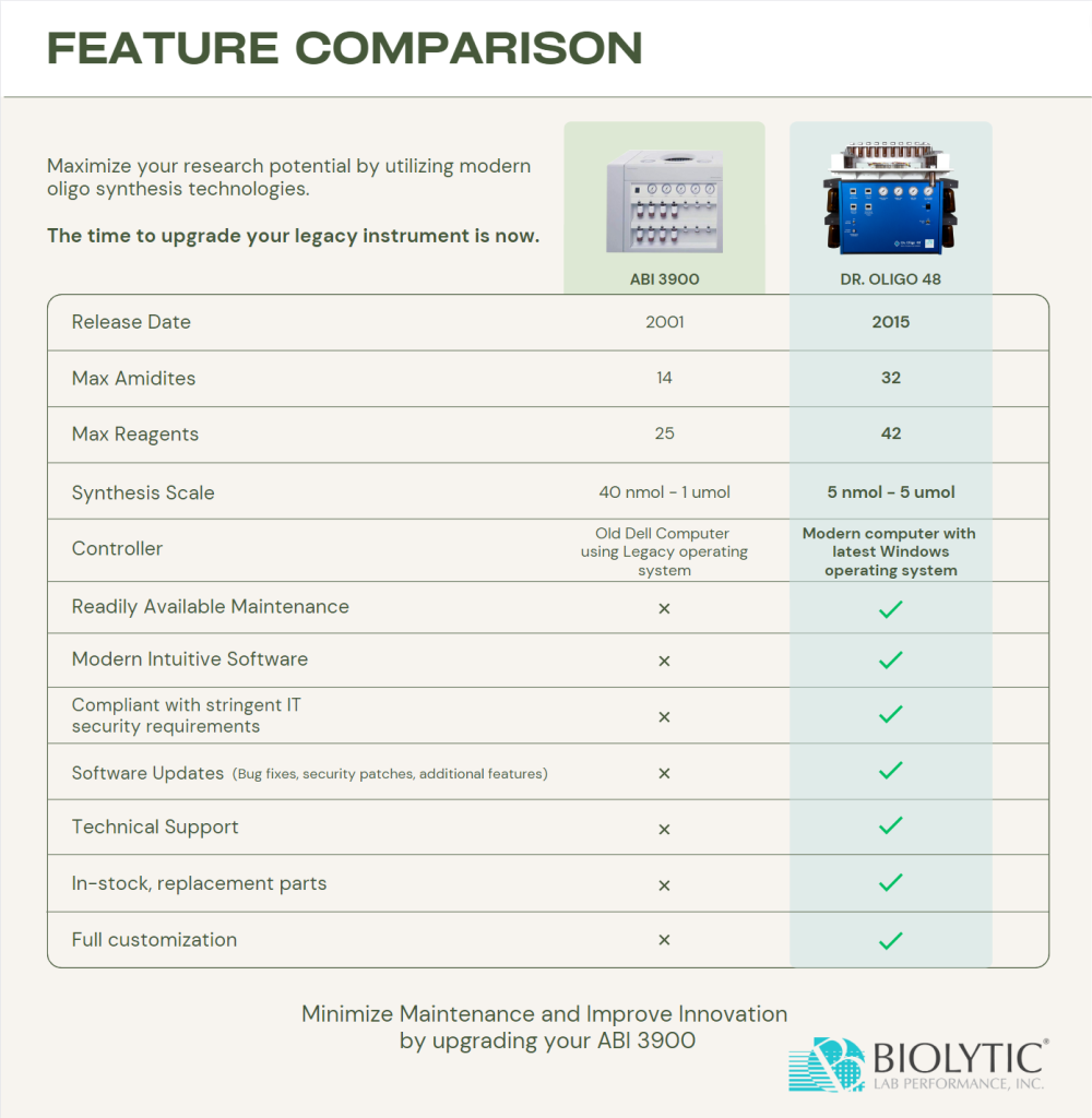 Comparing features of the ABI 3900 and Dr. Oligo 48. The Dr. Oligo 48 expands research capabilities with modern features, continuous support, and increased reliability.