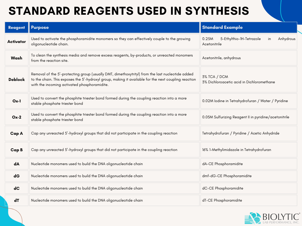 - Deblocking Reagent: Like TCA / DCM, used to remove caps to free up reaction sites for coupling additional nucleotides.