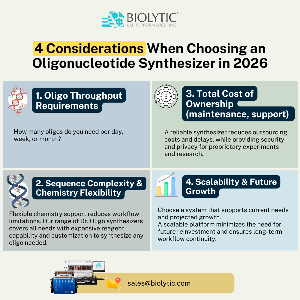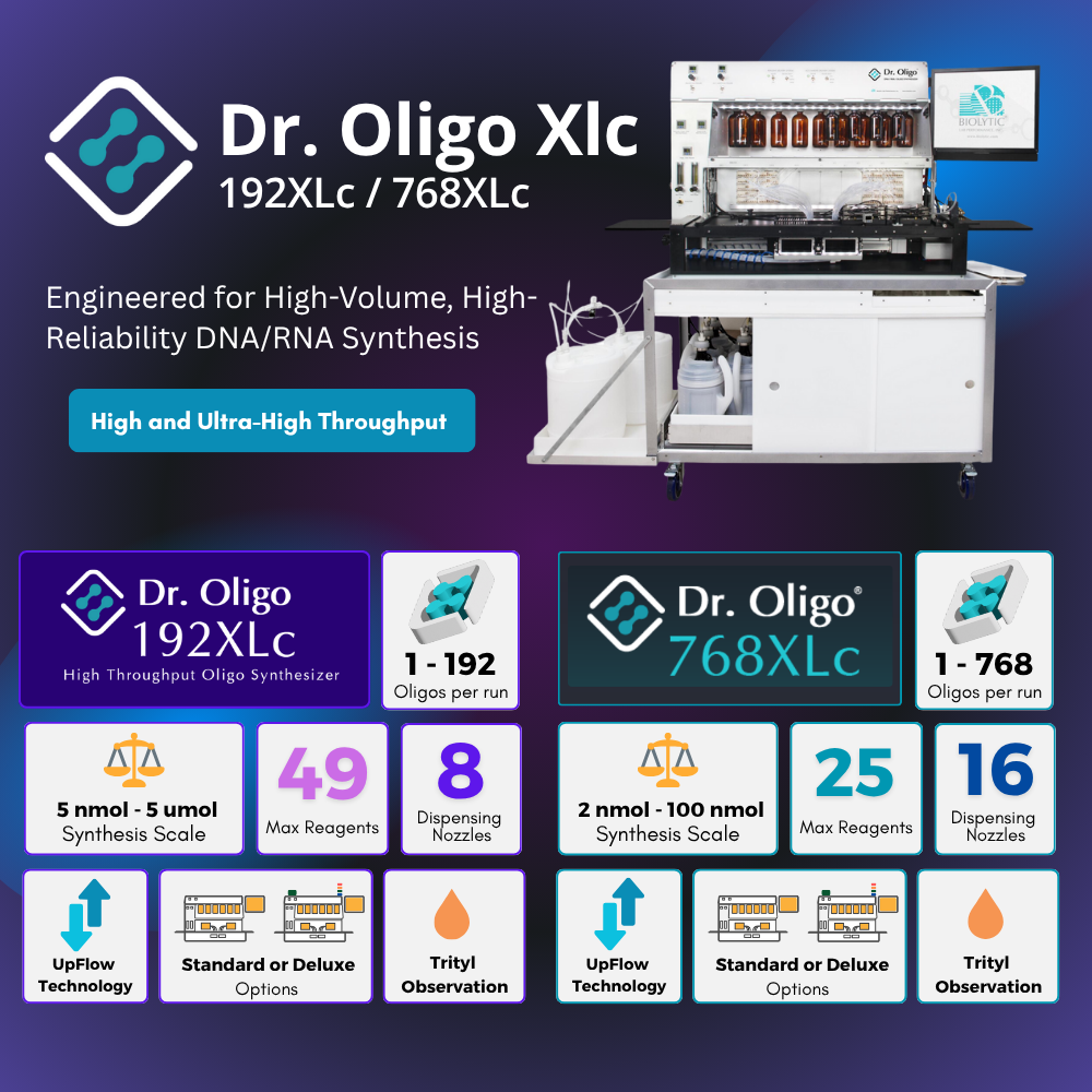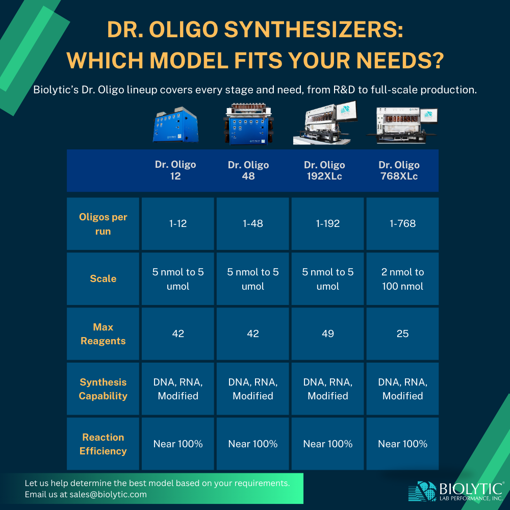 This guide provides a comprehensive overview of the key factors to consider, and how Biolytic’s Dr. Oligo Series (Dr. Oligo 12, Dr. Oligo 48, Dr. Oligo 192XLc, and Dr. Oligo 768XLc) compares across research and production needs.