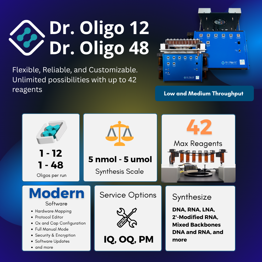 Flexible chemistry support reduces workflow limitations. Our range of Dr. Oligo synthesizers covers all needs with expansive reagent capability and customization to synthesize any oligo needed.